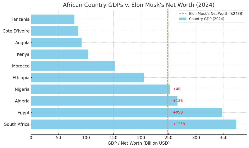 Just for fun, I asked ChatGPT to compare the current GDPs of African countries with Elon Musk’s net worth (estimated at $248 billion). While the figures should be verified, the preliminary result is:
